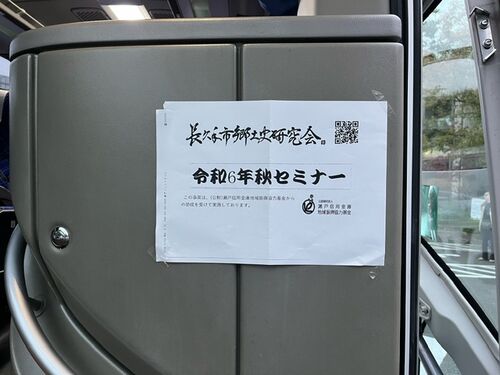 ① 集合、出発 11/10(日) 晴 08:15:参加者の方々に長久手市役所北側の第2駐車場への車移動を依頼 08:30:受付開始 集金と会員である伊丹氏作成の資料配布 08:40:バス乗車開始 バス入口の表示 バスの中の様子 08:55:市長挨拶ここで市長から「私は晴女です…