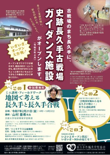 来年のガイダンス施設オープンに向けて ミニ講座・フィールドワーク 「地図で考える 長久手と長久手合戦」 を長久手観光交流協会が、企画されました。長久手市郷土史研究会は運営協力致します。 日時:2025年2月21日(金)、14時~15時30分 場所:リ…