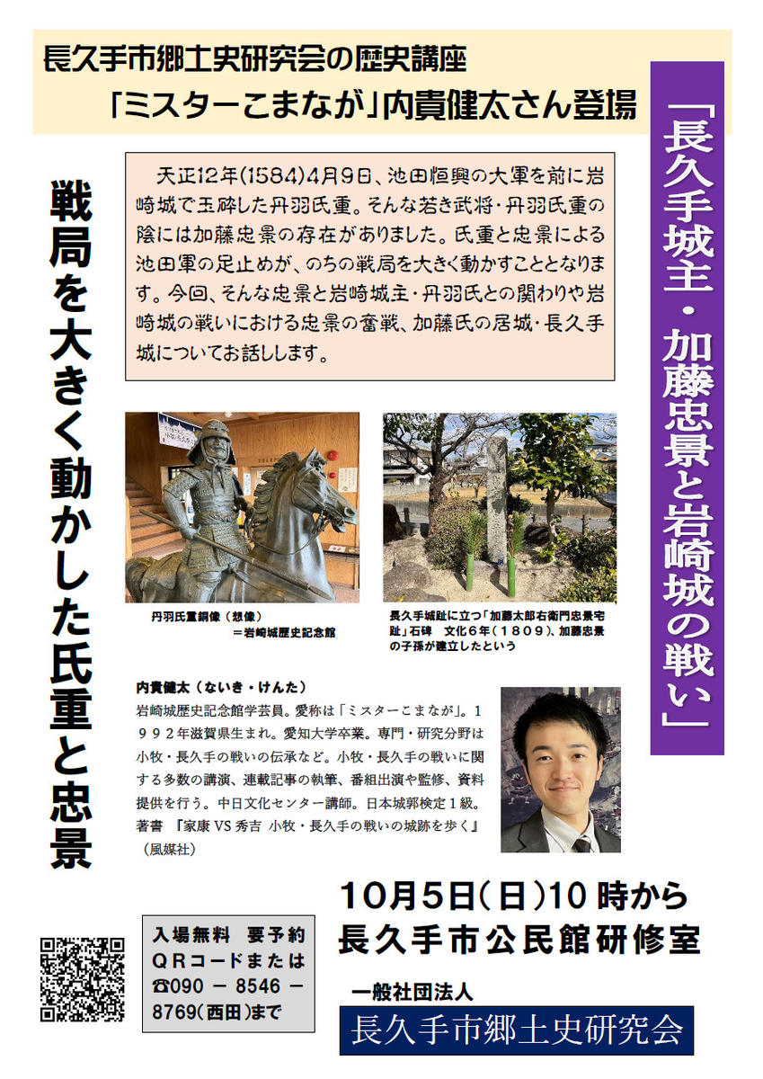 天正12年(1584)4月9日、池田恒興の大軍を前に岩崎城で玉砕した丹羽氏重。そんな若き武将・丹羽氏重の陰には加藤忠景の存在がありました。氏重と忠景による池田軍の足止めが、のちの戦局を大きく動かすこととなります。今回、そんな忠景と岩崎城主・丹羽氏との関わりや岩崎城の戦いにおける忠景の奮戦、加藤氏の居城・長久手城について、「ミスターこまなが」内貴健太さんがお話しします。